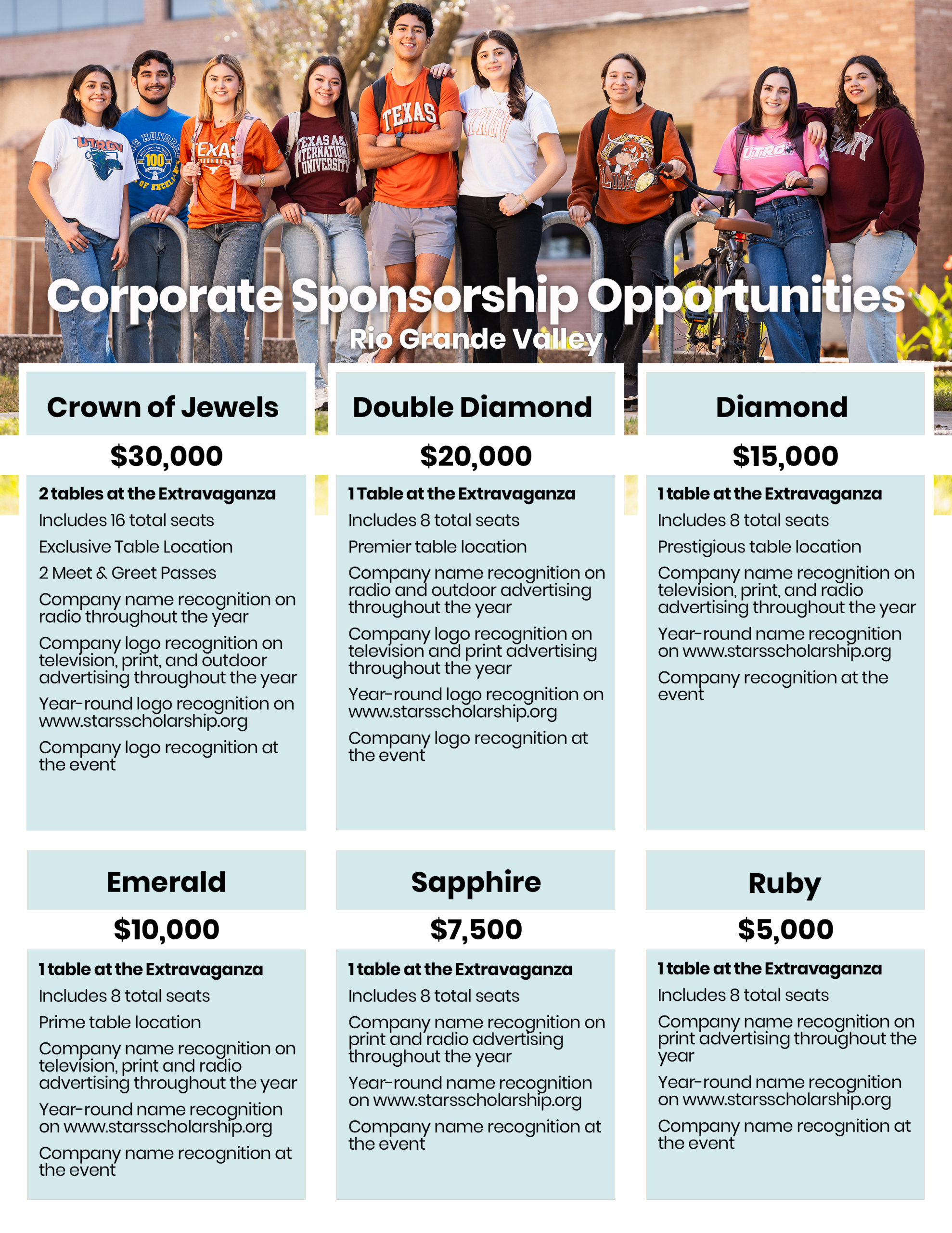 Sponsorship opportunities for the 2026 Rio Grande Valley Extravaganza are now available! Our sponsorship packet below includes full event details, a variety of sponsorship levels, and information about the students your support makes possible. Contact us today to receive your packet and reserve your table before they are gone.